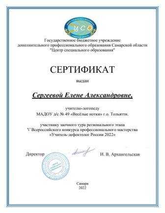 Учитель-логопед Сергеева Елена Александровна приняла участие в заочном туре регионального этапа V Всероссийского конкурса профессионального мастерства "Учитель-дефектолог России - 2022". Желаем дальнейших профессиональных успехов!